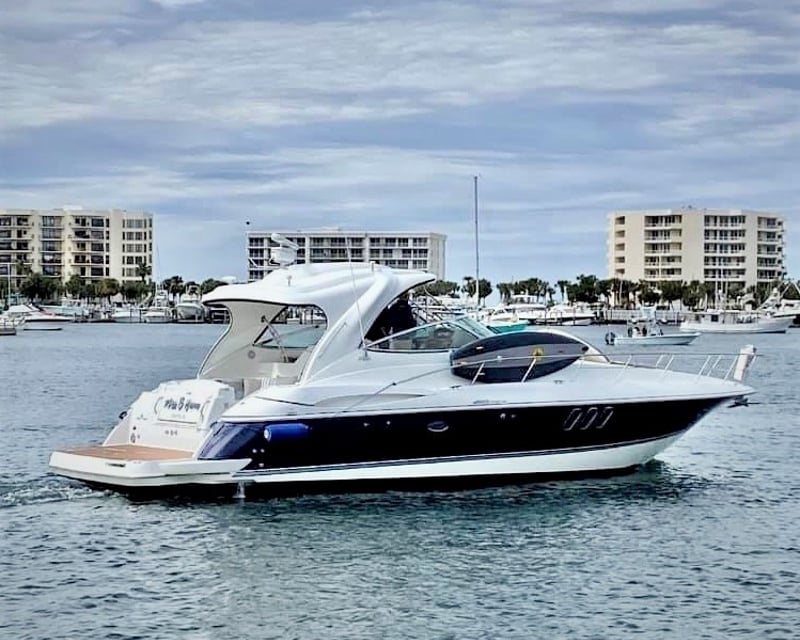 Cruise emerald waters aboard a 45' Hatteras yacht, swim and spot dolphins with up to 12 guests