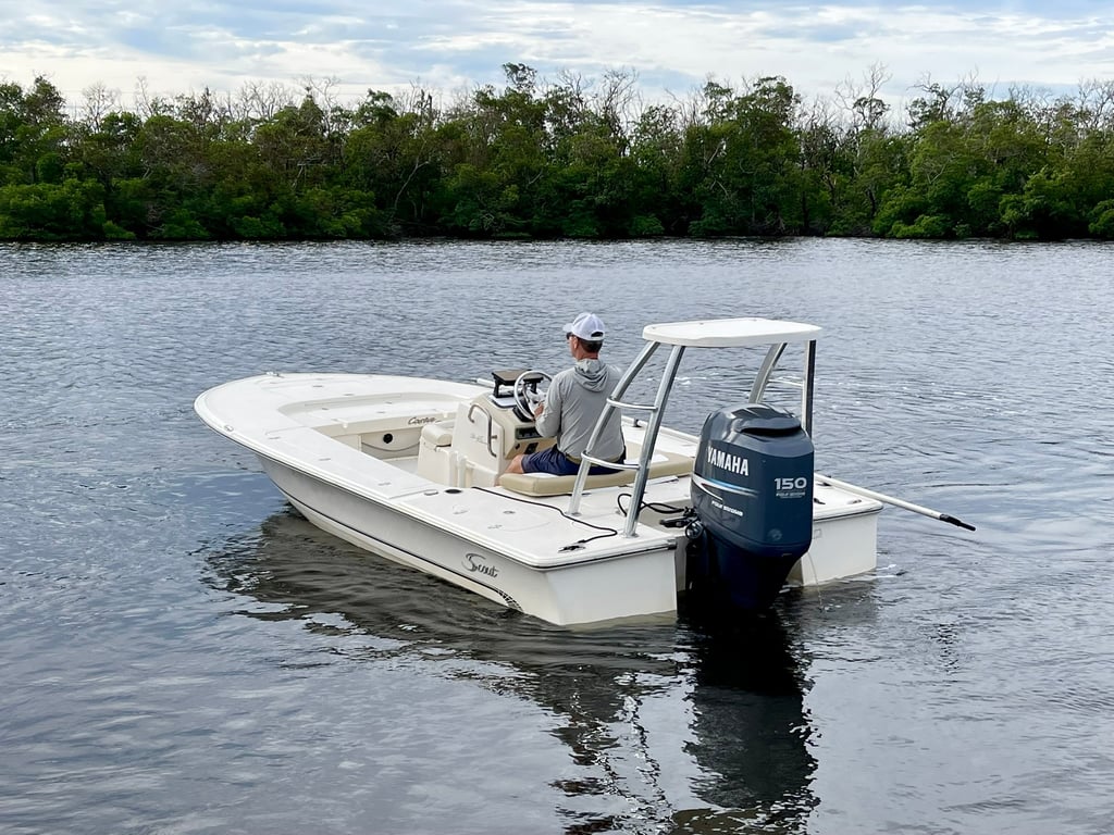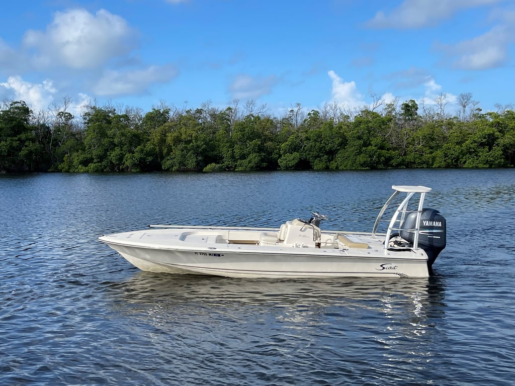 Experience a versatile 19′ Scout Flats boat, perfect for fly fishing adventures with friends or family. Enjoy flexible rental options and explore scenic waterways.