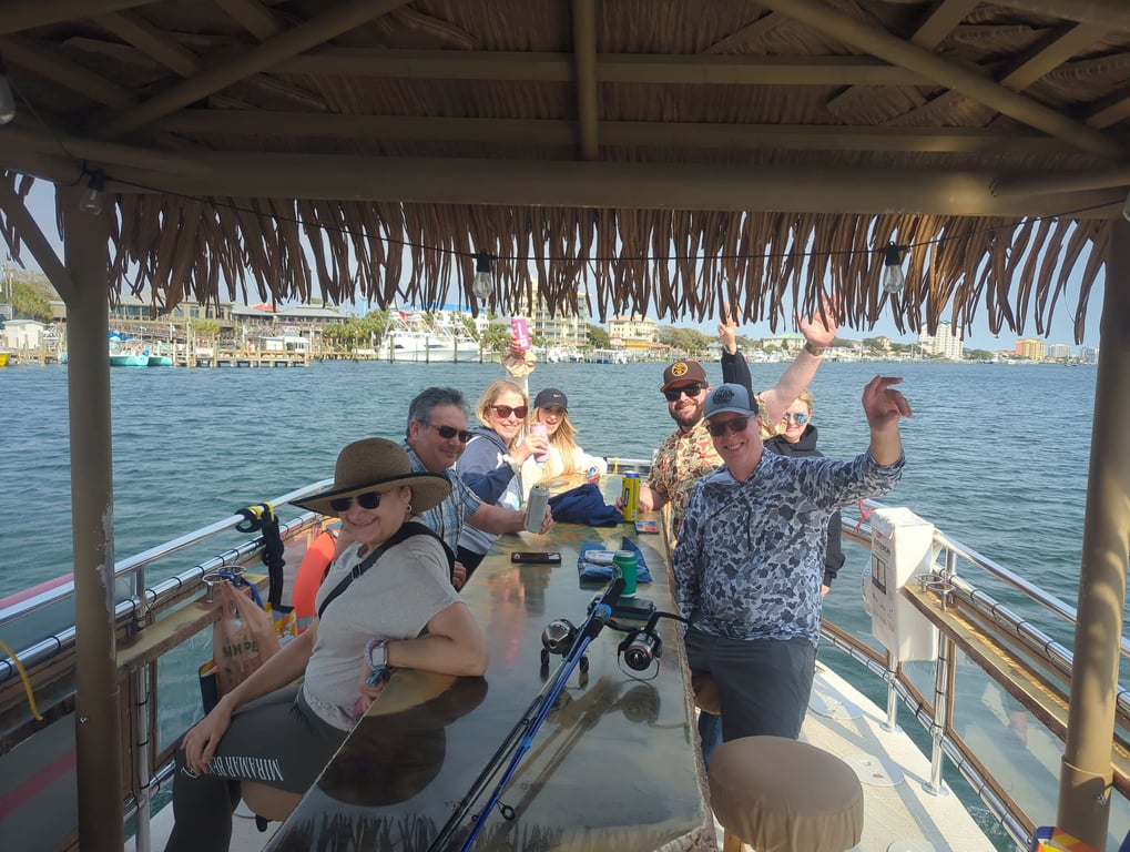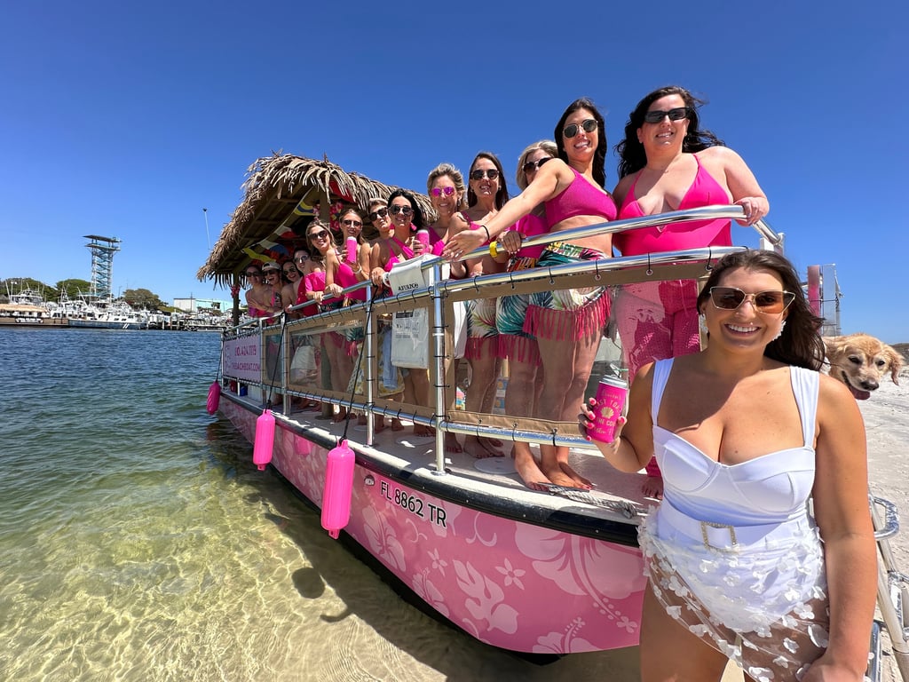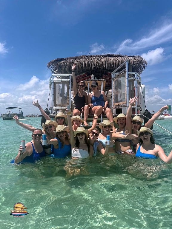 Cruise on a private tiki boat to Crab Island, swim and relax with included water, ice, floats, and paddle board