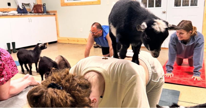 Stretch alongside friendly alpacas and playful goats during a relaxing farm yoga session.