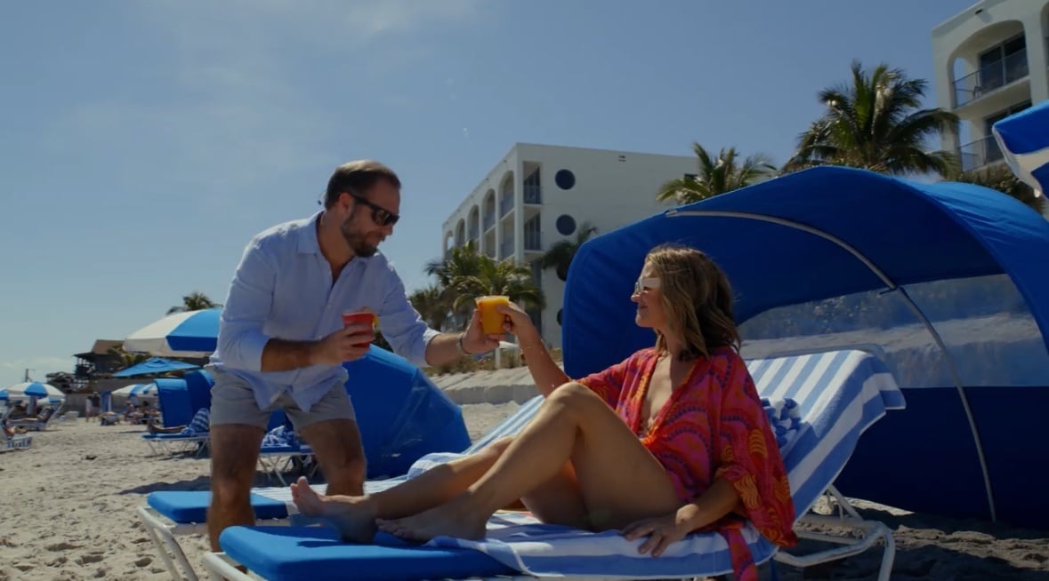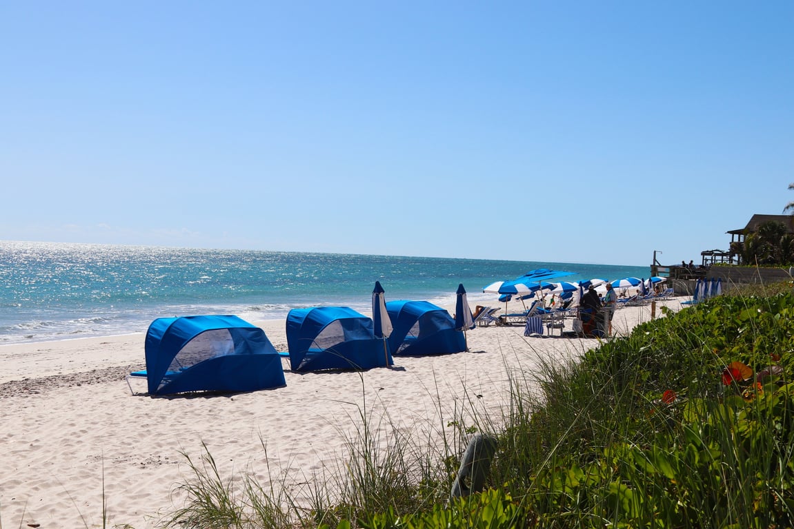 Enjoy a private cabana with chairs and umbrella for a full day of seaside relaxation