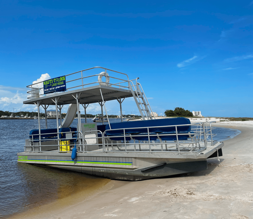 Relax on a spacious two-level barge with a built-in slide for a fun day at Crab Island