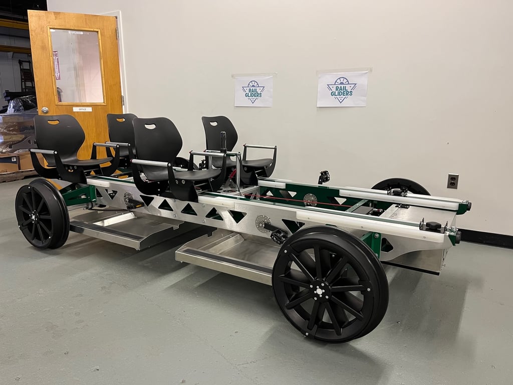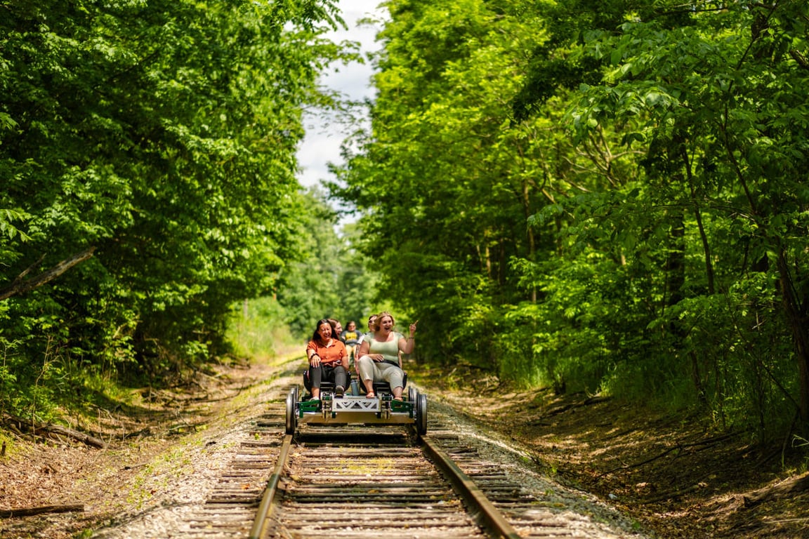 Nickel Plate Express uses pedal powered quad bikes that sit on the rails and seat up to four passengers.