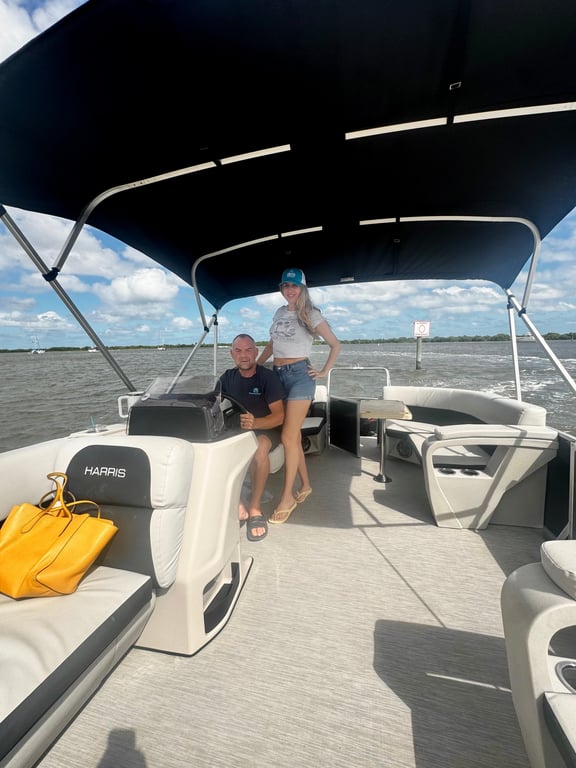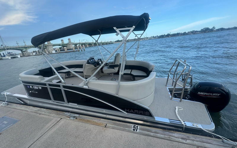 Ride a stable, zippy Harris 21BRZ tritoon on the St. Augustine intercoastal. Enjoy roomy seating, modern features, and power from a Mercury 150hp.