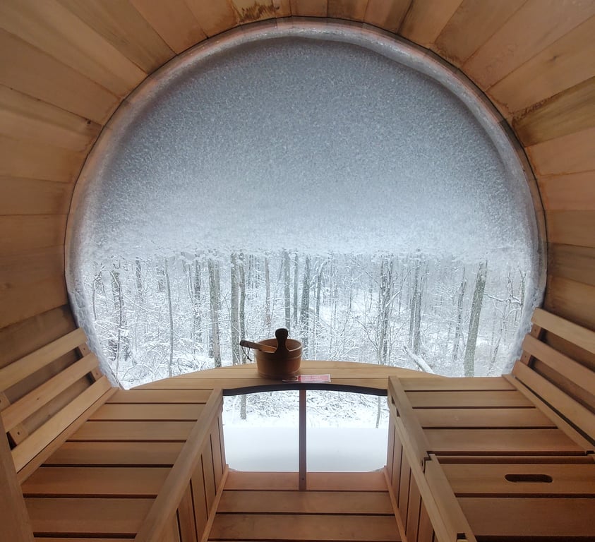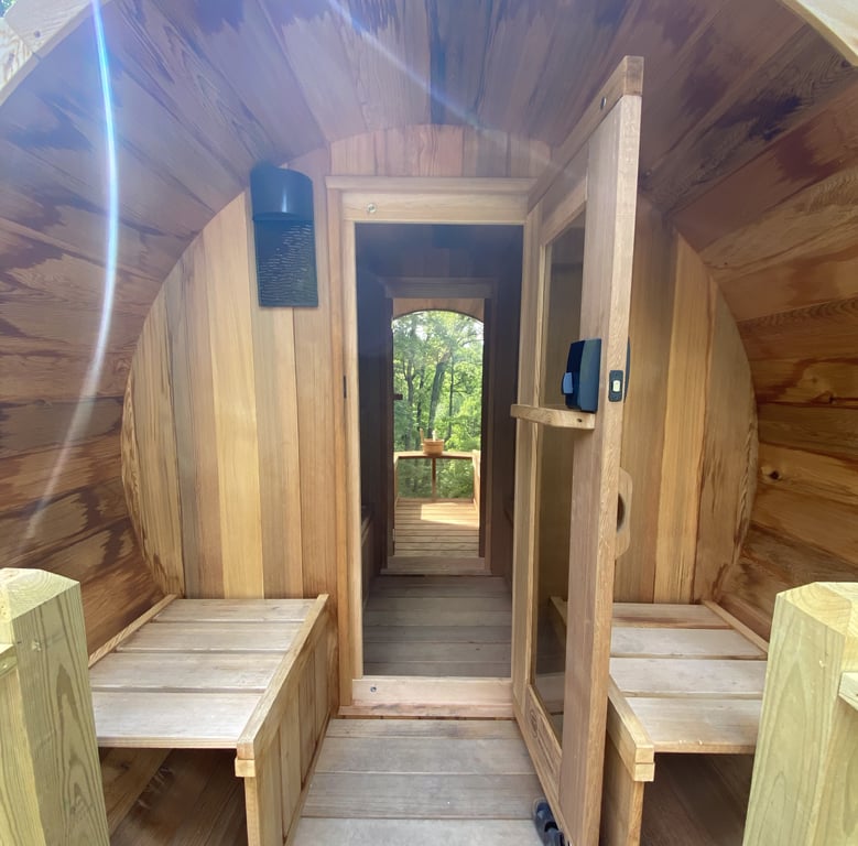 Book a barrel-shaped, cedar sauna featuring a floor-to-ceiling fish-eye window facing a Hocking Hills view. Drive right up—no hiking required.