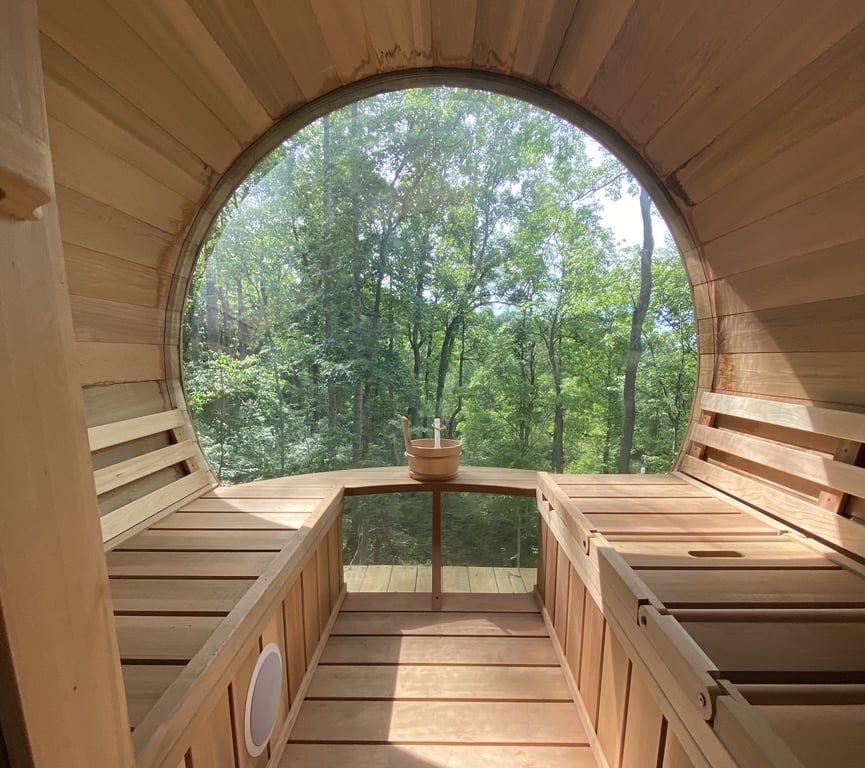 Relax in a cedar barrel sauna with Hocking Hills views and Bluetooth audio