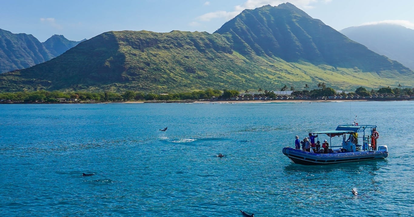 Head offshore from Waianae Harbor on a fast speedboat for a 3-hour adventure. Swim with wild dolphins, watch spinner dolphins, and snorkel a reef with turtles and tropical fish.
