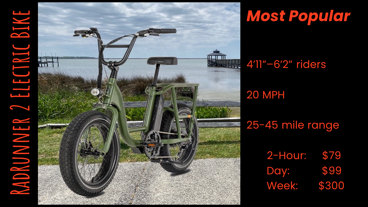 Discover the Outer Banks on an easy-to-ride electric bike. Choose how much you pedal and cruise up to 20 mph for a full-day adventure.