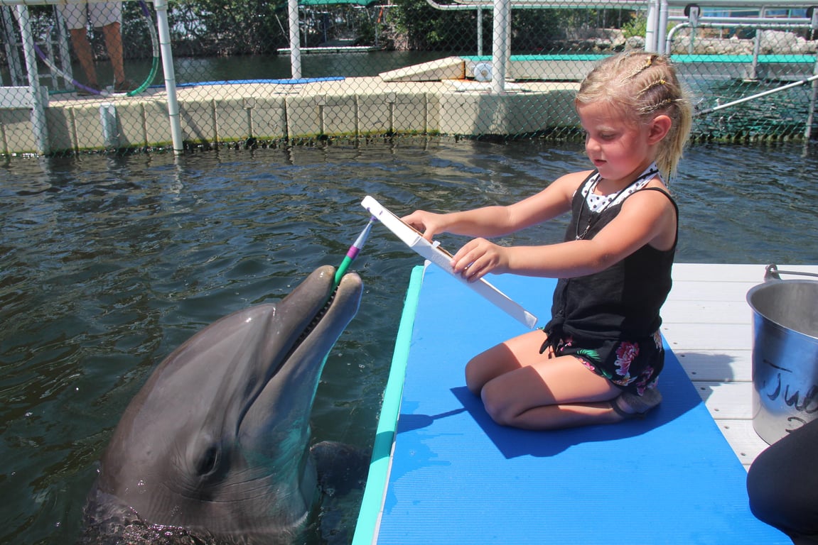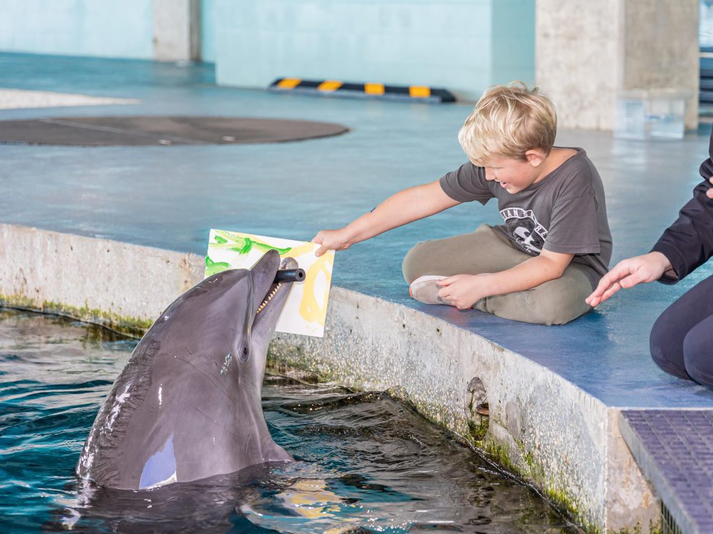 Enter the water on a floating platform and sit beside a trainer as a dolphin paints a vibrant canvas. Choose your color palette and help guide the brush while learning about the animal’s intelligence.