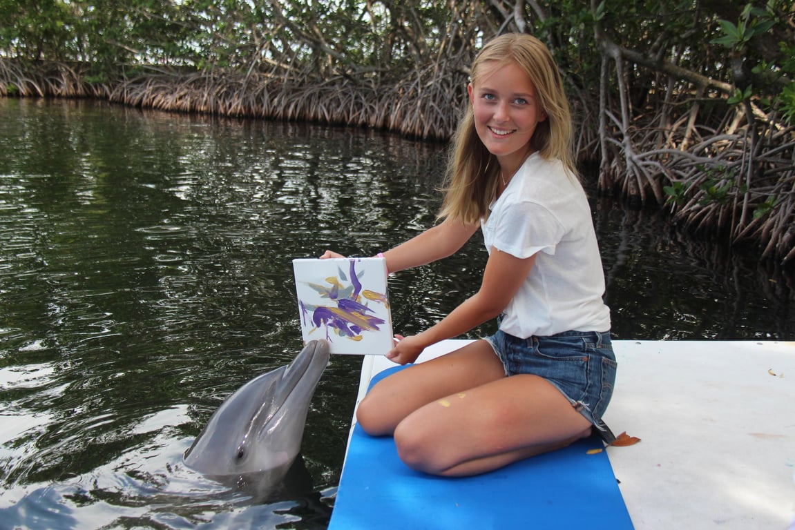 Assist a dolphin in crafting a marine masterpiece and witness their playful creativity up close.