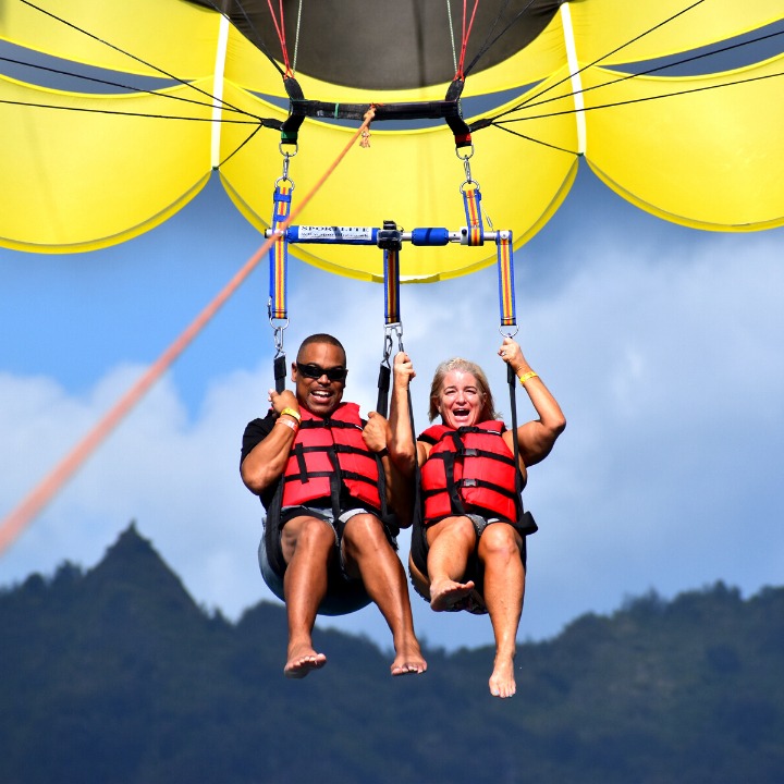 Lift off from a custom parasailing boat for a safe, family adventure over Maunalua Bay. Enjoy spectacular views of Oahu while you soar up to 600 or 800 feet.