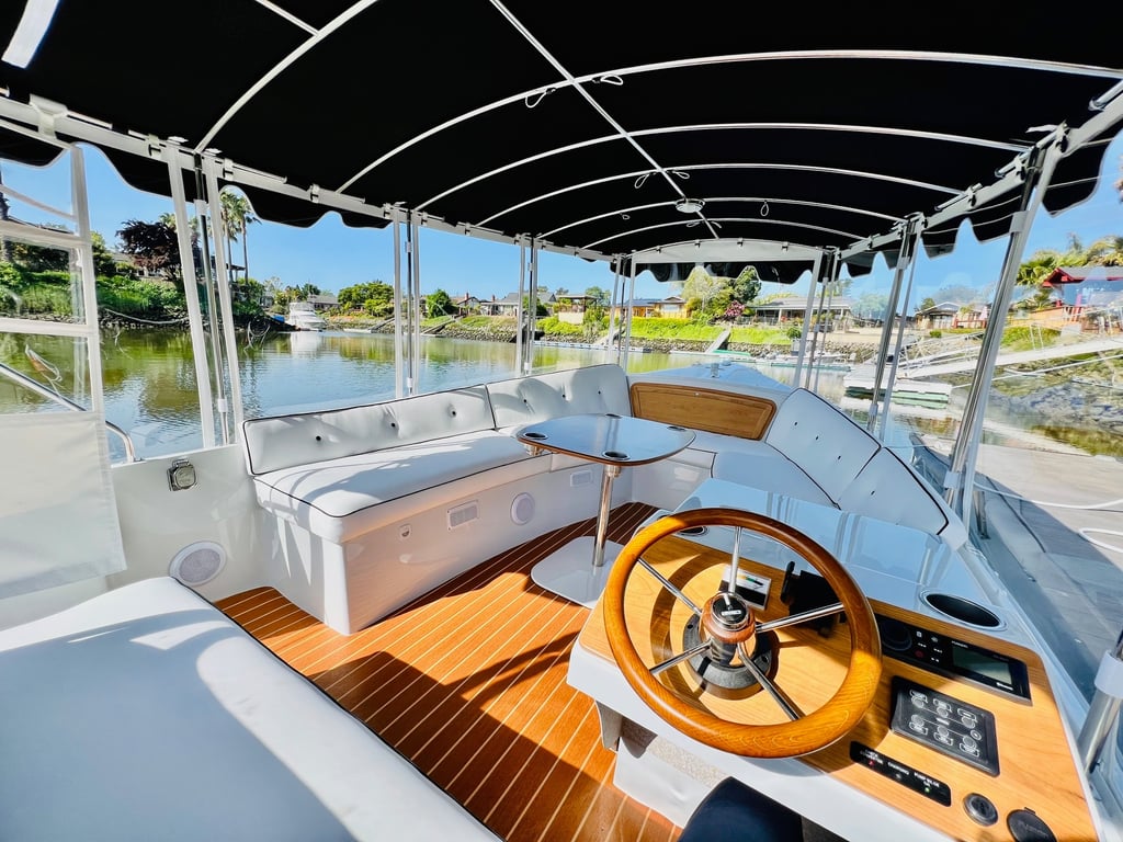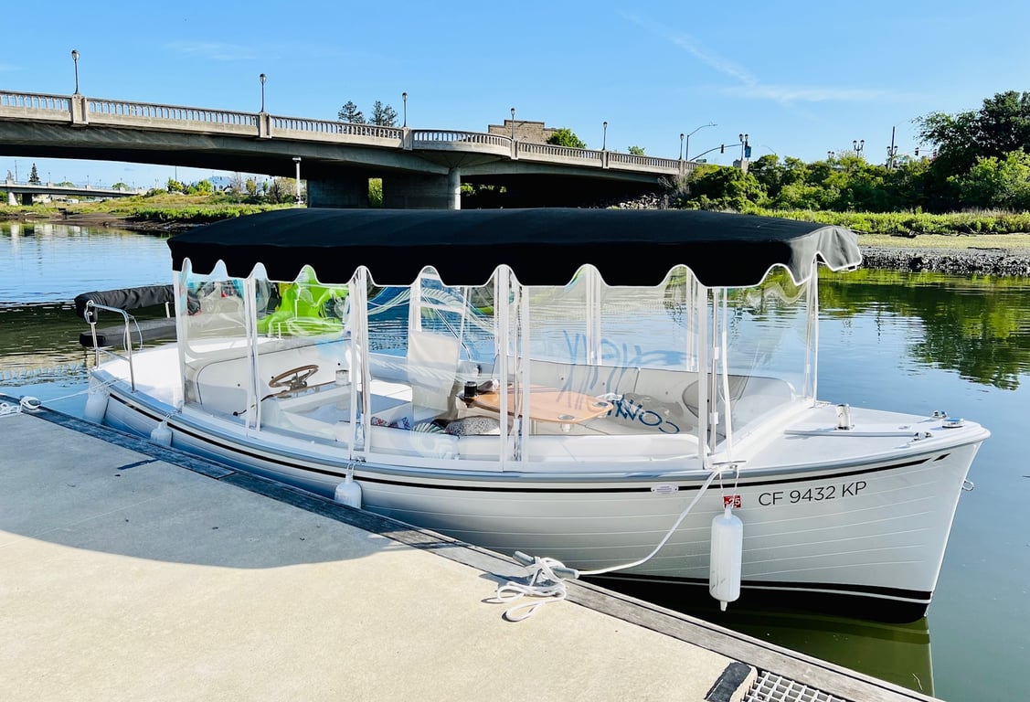 Cruise the Napa River aboard a 22’ electric Duffy SunCruiser featuring indoor lounge seating and an open-air deck. Enjoy scenic views while sipping your own beverages during this private one-hour outing.