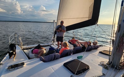 Captain Butch and first mate Robin have clearly mastered the art of hosting memorable sailing experiences. Guests consistently rave about their warm, accommodating nature and how they go the extra mile to make trips special. The spacious catamaran provides a comfortable setting for sunset cruises, swimming, tubing, and just relaxing on deck. Several reviewers mention returning year after year, which speaks volumes about the quality of the experience. The onboard crew deserves special mention: Captain Cruise and Diesel (the well-trained dogs) plus Mango the cat have become beloved fixtures that kids especially adore. Families appreciate that Butch welcomes guests to bring their own food, drinks, and even pets. He's happy to teach sailing basics, let guests take the helm, and has even helped coordinate surprise proposals with photos to match. The intimate group size keeps things personal and relaxed compared to crowded tour boats, creating the kind of laid-back atmosphere that makes vacation memories stick.