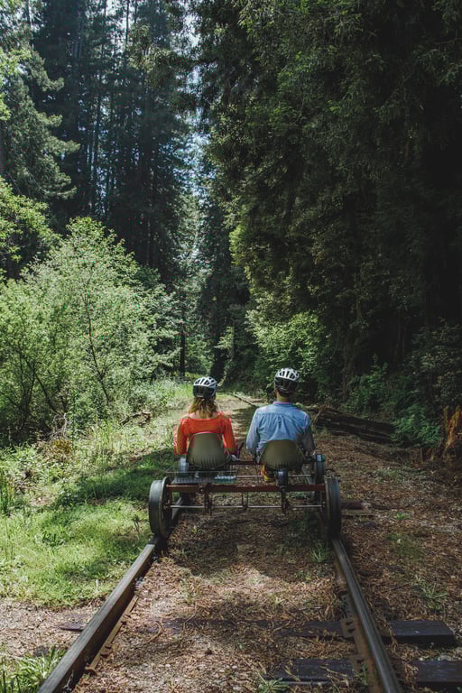 Pedal an electric-assist railbike through redwood groves and along Pudding Creek with a guide.