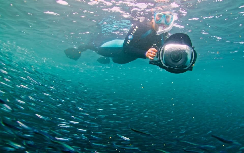 Swim offshore to encounter sunfish, bait balls, and seasonal whales on a 6-hour guided ocean adventure.
