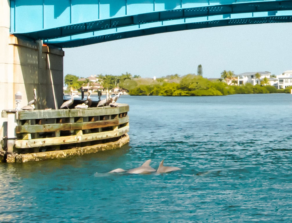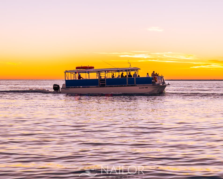 Watch playful dolphins and a vibrant Gulf sunset while enjoying complimentary beer and wine.