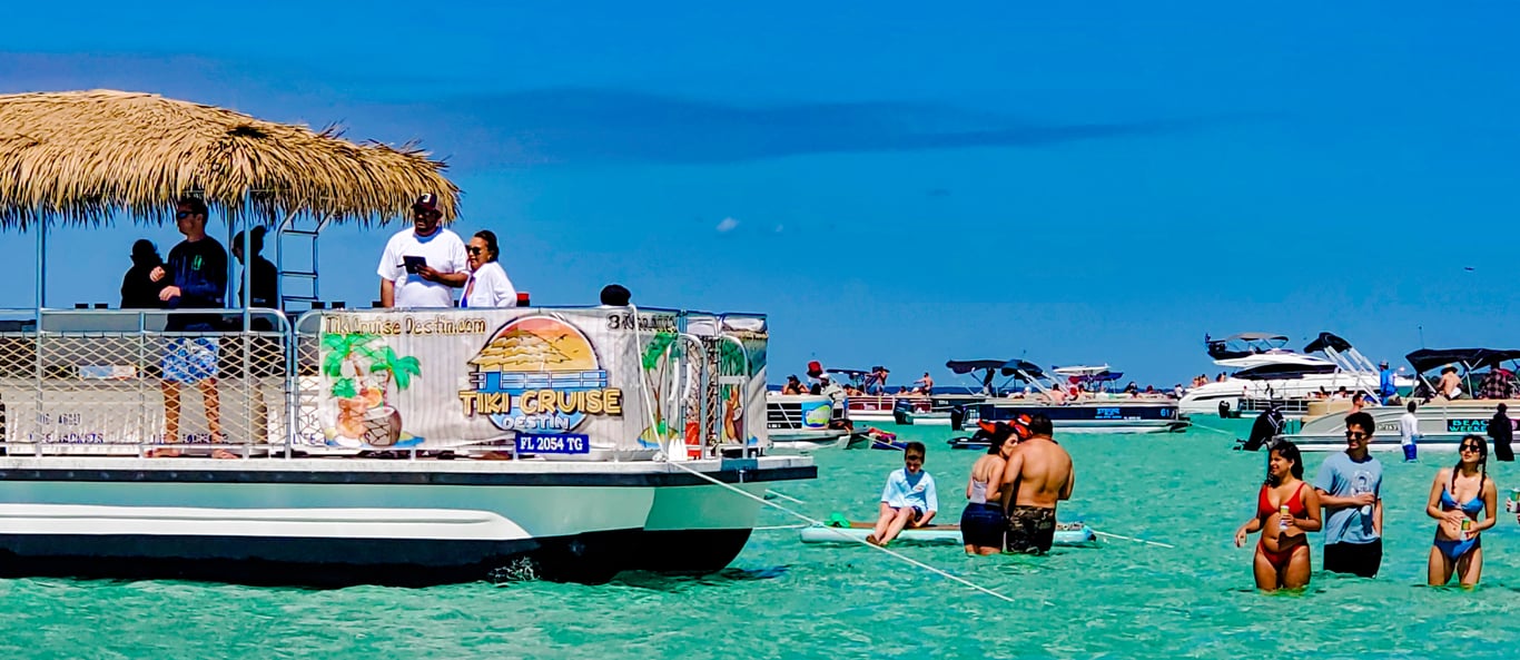 Set sail on a private Tiki Boat cruise to Crab Island in Destin, FL. Relax with friends or family and enjoy water activities and scenic views.