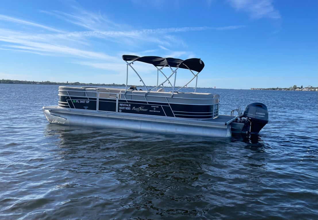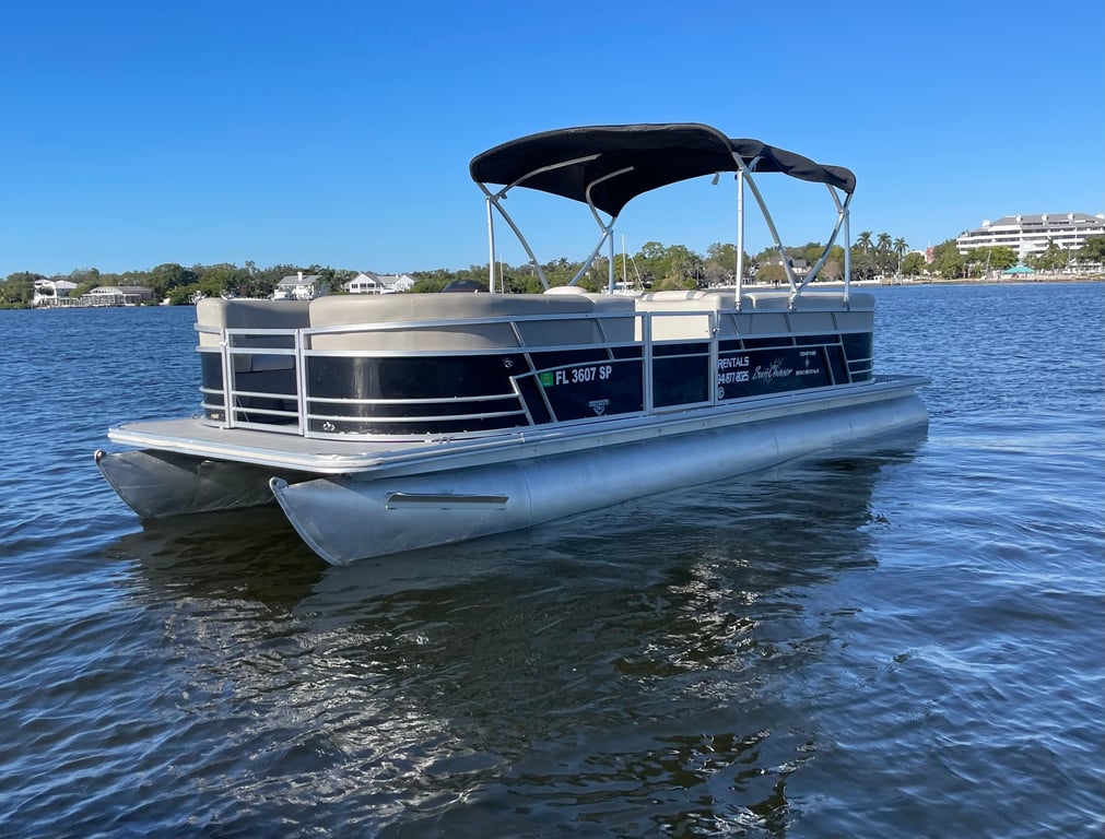 Bask on the water aboard a spacious 24-foot SunChaser pontoon built for relaxing family days and sandbar explorations. Enjoy wrap-around seating, Bluetooth tunes, and GPS guidance while you explore at your own pace.