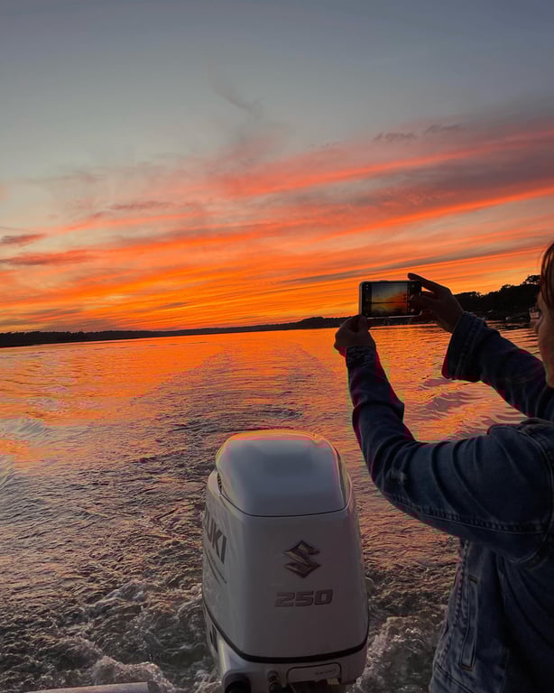 Wow, what an unforgettable evening on this May River sunset cruise. From the moment our family stepped aboard our Captain Freddy made our evening together truly exceptional. First, we were amazed that our trip departed with just the 3 of us. Our boat was very clean and quiet. As we cruised around the May River, Captain Freddy shared so many fascinating facts about dolphins and the area. We were lucky to encounter at least 4 pods of dolphins. Plus, we saw baby dolphins less than one month old. The beauty of the May River, with its vistas of marsh grasses, birds, dolphins, and serenity, makes this cruise a five-star trip in itself. Our evening ended with a beautiful sunset and a leaping dolphin. Truly magical.