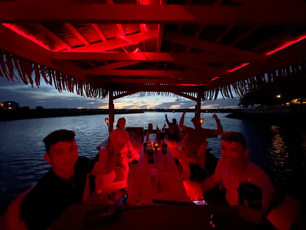 Set out on a sunset tiki boat eco cruise with island music and a tiki bar. Bring your favorite drinks and snacks, watch for dolphins, and jump in from the diving platform.