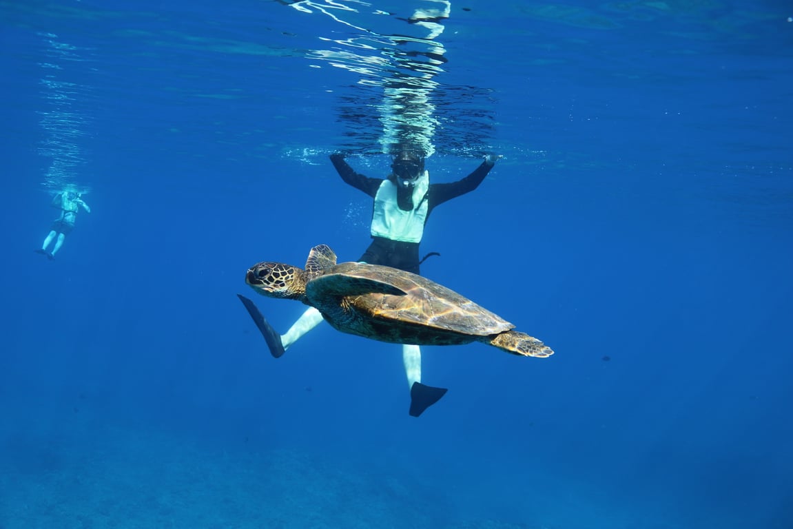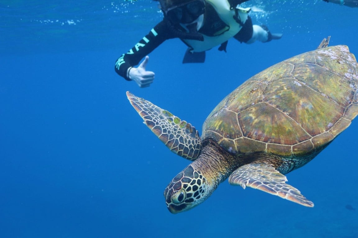 Swim with green sea turtles on a guided snorkel from a double-decker boat with a safety-certified crew.