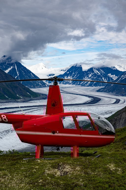 Soar over the Matanuska Glacier on a private helicopter tour with two landings. Choose your second landing on the glacier or a nearby mountain ridge for sweeping views.