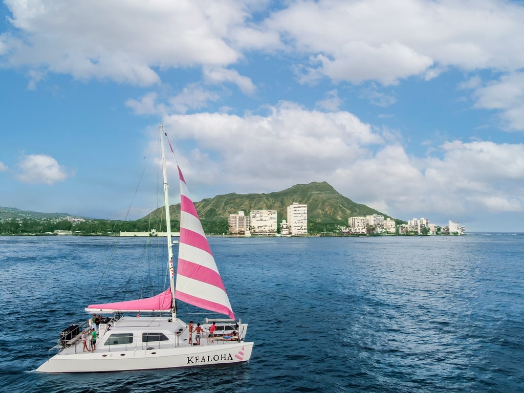 Enjoy a swim-optional sunset sail along the Waikiki coastline with inside and outside seating